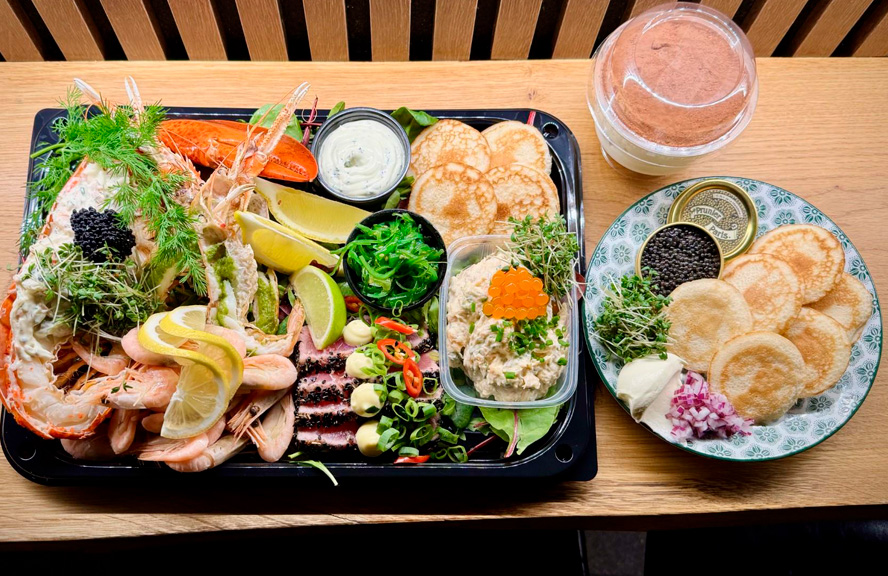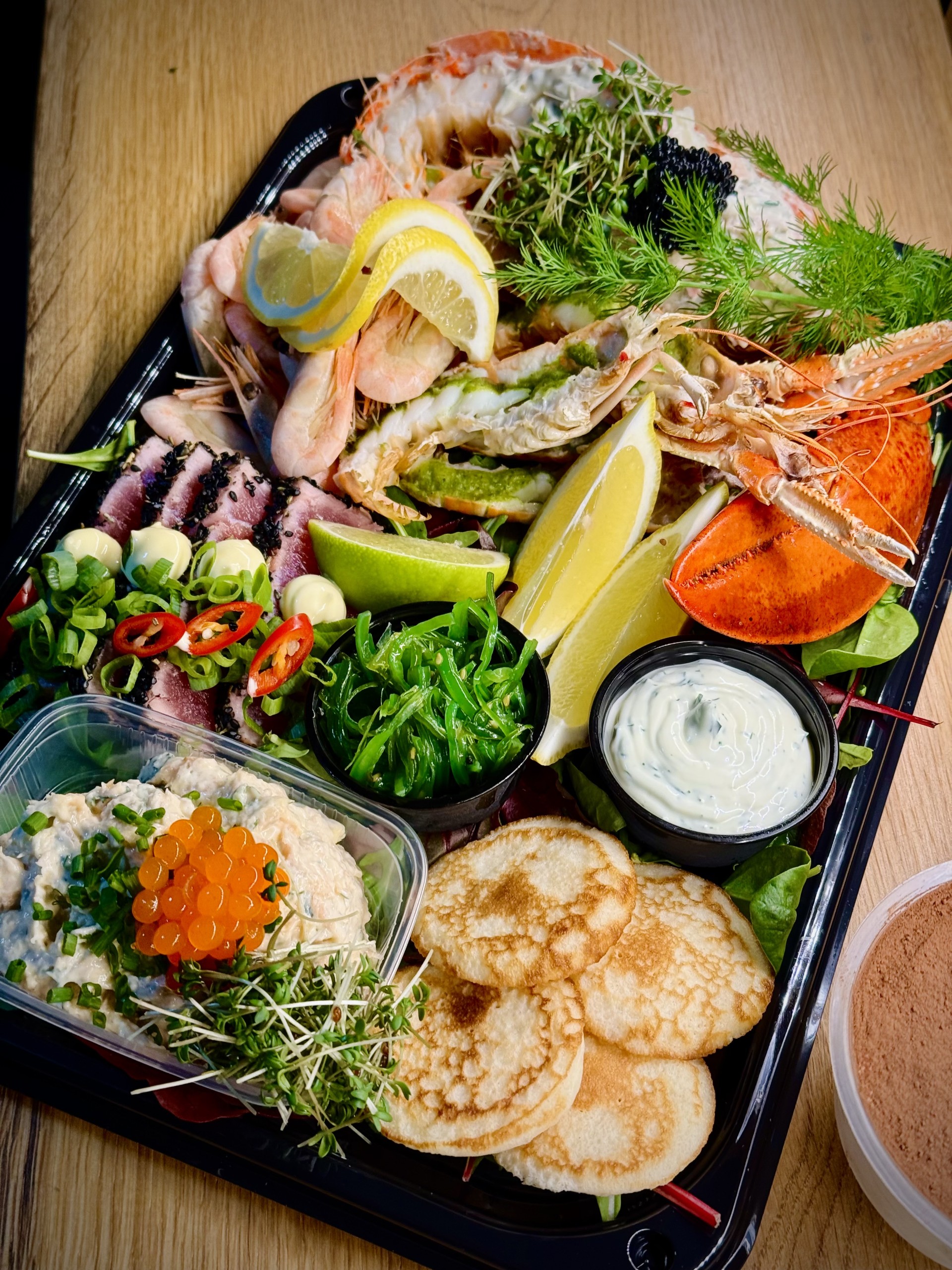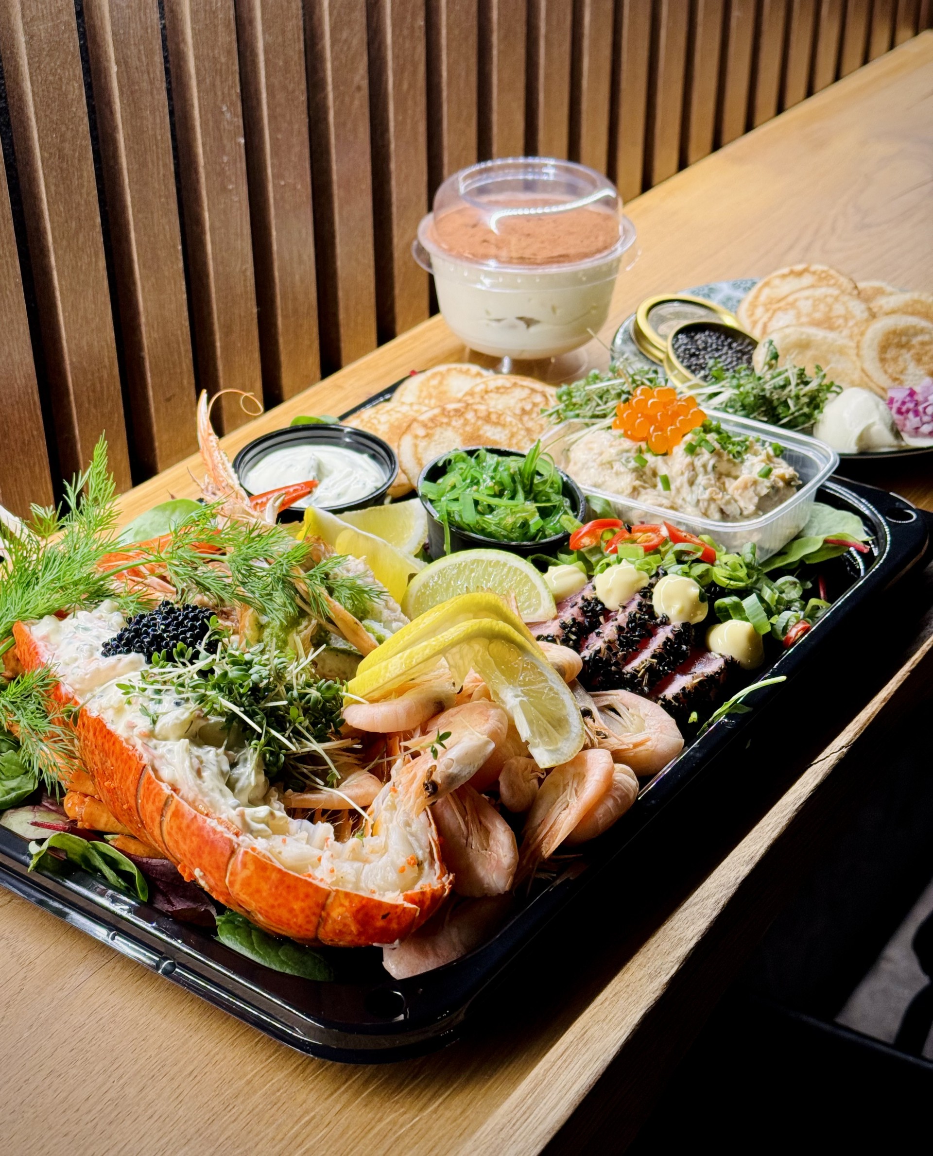 Hovedret - Halv hummer med fyld af skaldyrssalat, bagte jomfruhummere med pesto genovese, og pil selv rejer serveret med citron, og hjemmelavet urtecreme.
