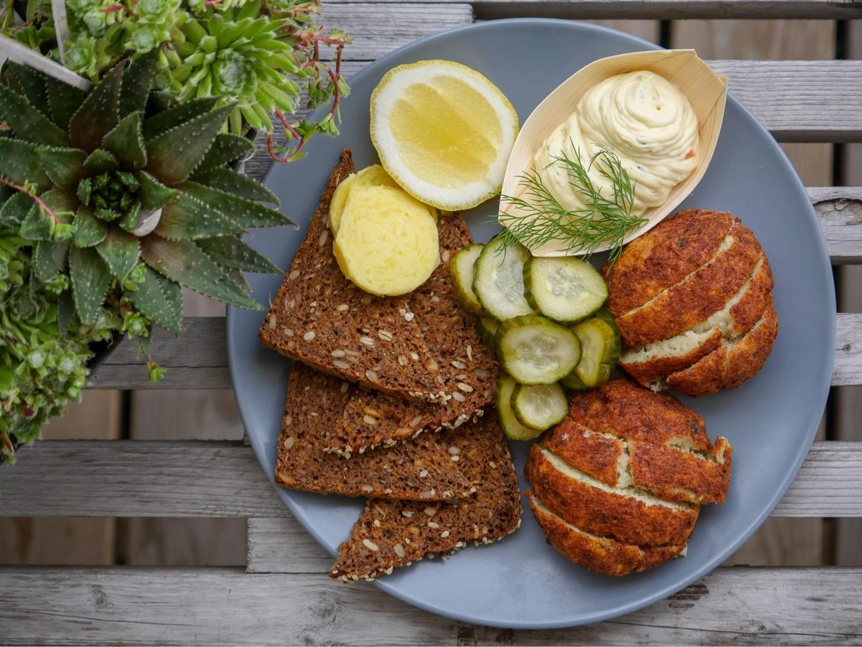 Ny stegte fiskefrikadeller lavet på torsk, serveret med rugbrød, hjemmerørt remouolade & syltede agurker
